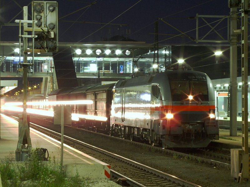 RailJet-Taurus "Spirit of Linz" steht mit dem 50516 in Wels Hbf, während auf dem Nebengleis eine 185er mit Güterzug durchfährt. (Von Bahnsteig 5 aus aufgenommen) [28.07.08, 21:52]