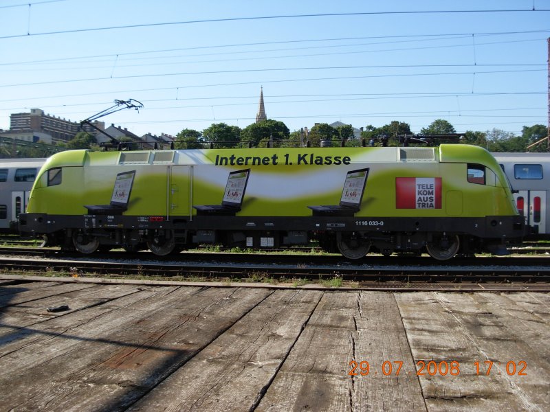 Noch sind beide Bügel abgezogen und die Werbelokomotive 1116 033-0 der Telekom Austria wartet in der Traktion Wien West auf ihre nächste Fahrt, welche nach Salzburg führen wird; aufgenommen am 29.7.2008.