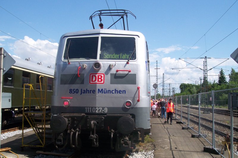 111 027 trägt Werbung für den 850. Münchner Stadtgeburtstag.