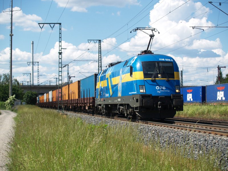 1116 260-9, welche bei flüchtigem Hinsehen leicht für eine Standard-Lok gehalten werden könnte, wirbt für den Europäischen Lokführerschein (30.5.2008).