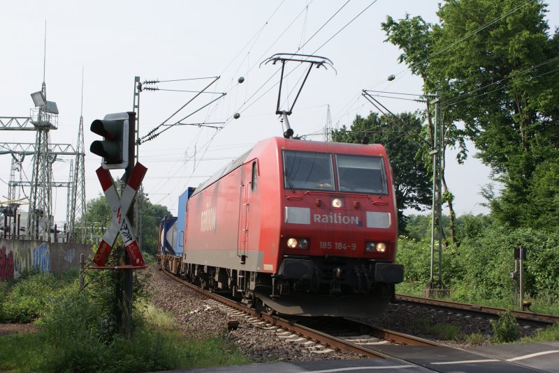 185 184-9 mit einem Containerzug am Km 28,190 in Düsseldorf am 29.05.2008