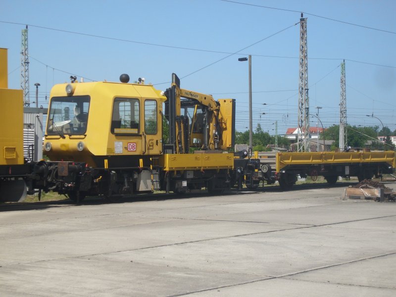 Abgestellt in Coburg, im Bereich des Güterbahnhofes, war Kranwagen 97 82 46 506 17-1 der Firma Wiebe mit Schutzwagen am 30. Mai 2008.