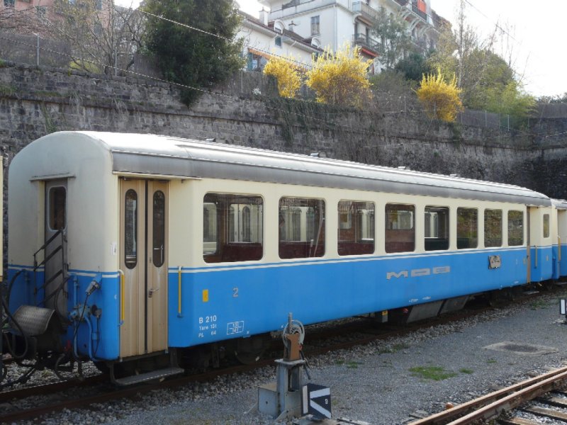 MOB - Personenwagen 2 Kl. B 210 im MOB Bahnhofsareal von Montreux am 05.04.2008