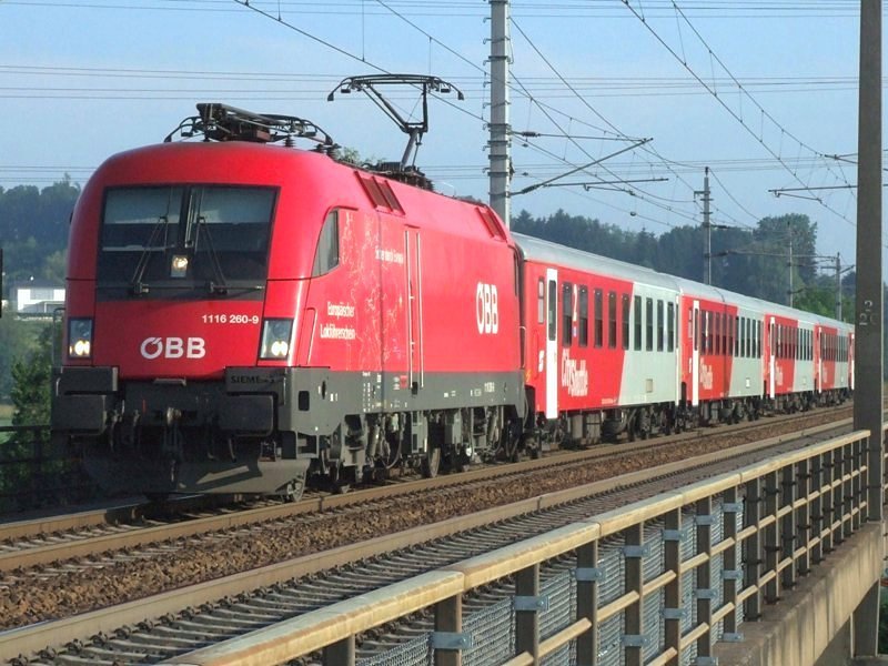 Der Cityshuttleintercity IC 559 "Stadt Bruck an der Mur" von Wien nach Graz wurde am 1.6.2008 von 1116 248 traktioniert. An diesem Tag fand sich in diesem Zugverband sogar ein Fernverkehrswaggon. Im Normallfall besteht er aus reinen Cityshuttlewaggons. Die Aufnahme enstand ca. einen Kilometer vor Mürzzuschlag auf der Semmering Südrampe.