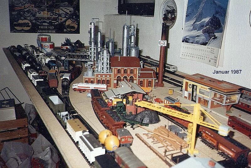 Der hintere Anlagenteil mit Ölraffinerie, Kohlenhandlung und Bahnhof in der Bauphase im Januar 1987.
