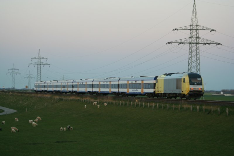 DISPOLOK ER20-001 am Abend des 23.4.2008 auf der Fahrt von Sylt in Richtung Niebüll in Höhe Hindenburgdamm.