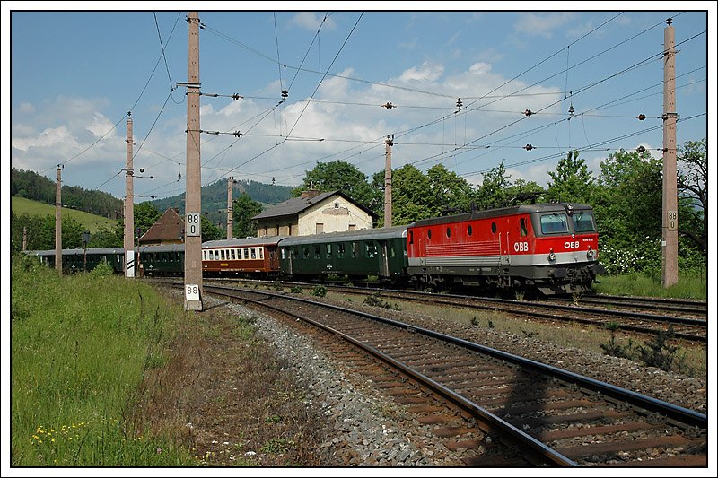 1216 226 (Tschechien) hat am 22.5.2008 in Spielfeld-Straß den OEC 156 „Zagreb“ von Zagreb übernommen und brachte ihn in weiterer Folge nach Wien. Die Aufnahme zeigt den Zug bei der Durchfahrt der Station Kapfenberg-Fachhochschule.