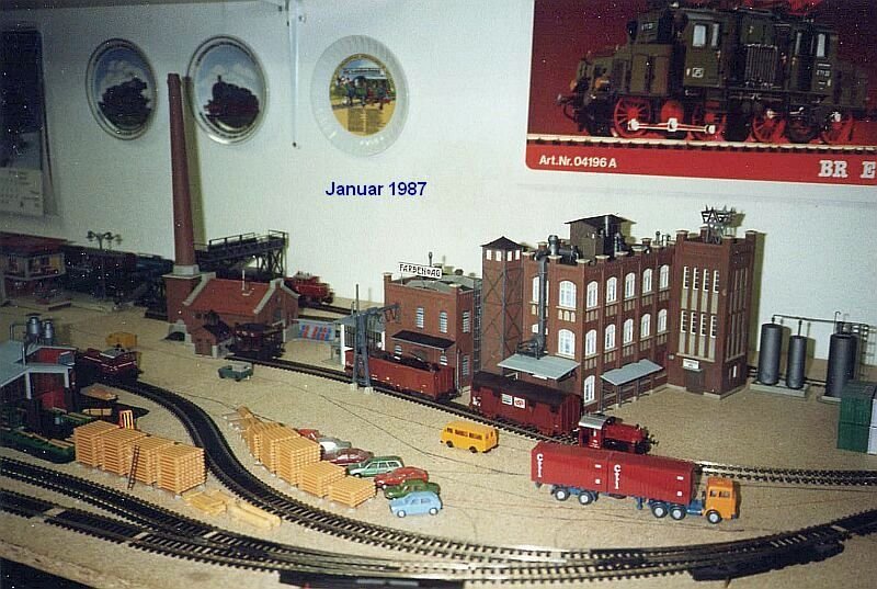 Hier die Verbindung Ursprungsplatte / Abstellbahnhöfe im Oktober 1987. Die Verbindung zum oberen Abstellbahnhof auf der linken Seite, darüber die Auffahrrampe zum Industriegebiet, hinten an der Wand noch einmal 3 Abstellgleise, die eigentlich ein unterirdischer S-Bahnhof mit Seiteneinblick werden sollte und immer noch werden sollen. (Bis jetzt gibt es in H0 keine Rolltreppen, deswegen wurde es immer wieder zurückgestellt)