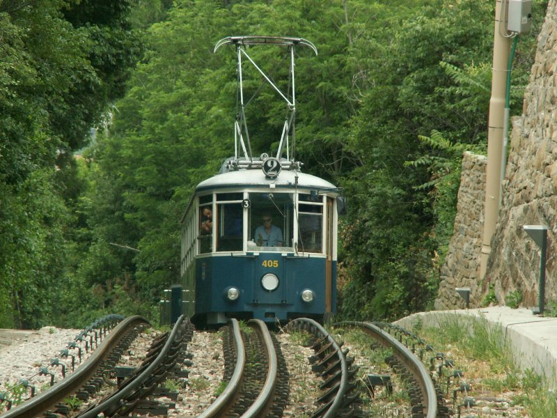 Wagen 405 auf der Steilstrecke zwischen Piazza Scorcola und Vetta Scorcola.Schön,das es diese über 100 jährige Strassenbahn aus der Zeit der Monarchie noch gibt.Triest 03.06.08