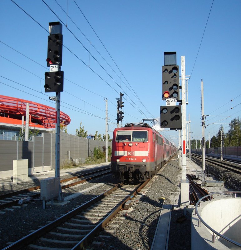223 066 mit Alex 86008 am 10.6.2008 in Regensburg. Als erster Wagen ist einer der beiden Alex  Silberlinge  eingereiht.