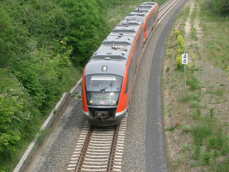 642 072 und ein weiterer Desiro haben als RB nach Saalfeld soeben Oberweimar verlassen. 2004-05-31.