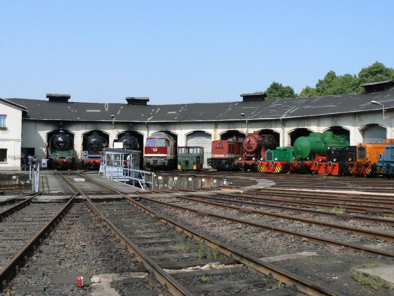 Fahrzeugparade am 31.05.2008 im Museums-Bw Nossen. Von links 18 201, 23 1113, 52 8047-4, LEG 232 004-2.