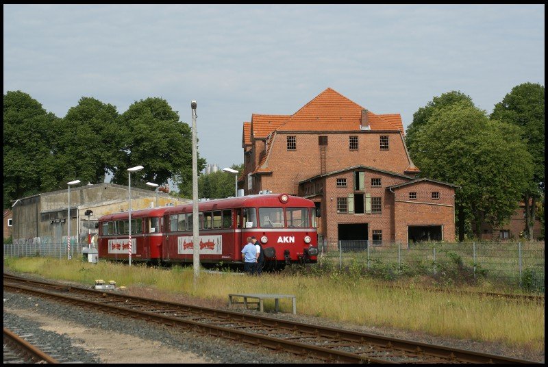 Die beiden historischen Schienenbusse der AKN warten am 07.06.2008 an der  Geno-Mühle  in Barmstedt auf den Einsatz nach Kaltenkirchen.