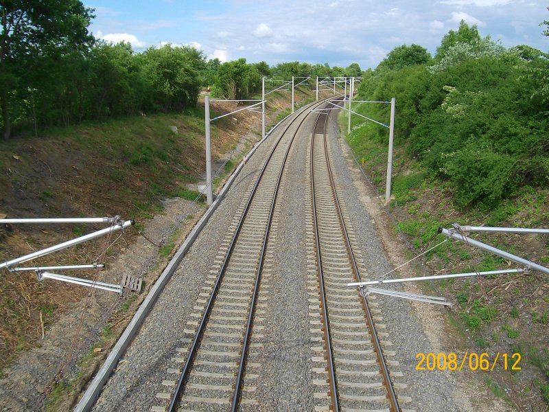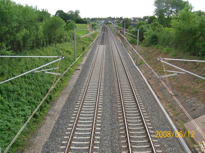 Blick auf die Kbs 140 nördlich von Reinfeld. Gut zu sehen auch die glänzende neue Oberleitung, die erst vor ein paar Wochen montiert wurde. 07.06.08.