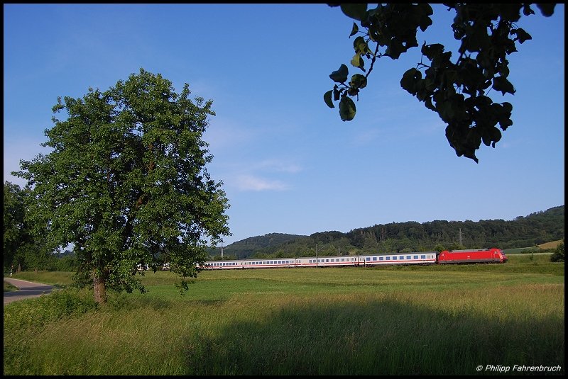 Weitwinkel-Spielerei am Abend des 09.08.06 mit IC 2062 von Nürnberg Hbf nach Karlsruhe Hbf, der von einer unbekannten 101er bei Aalen-Hofen an der Remsbahn (KBS 786) bildlich verewigt wurde. Der nächste Halt des Fernzuges ist Aalen.
