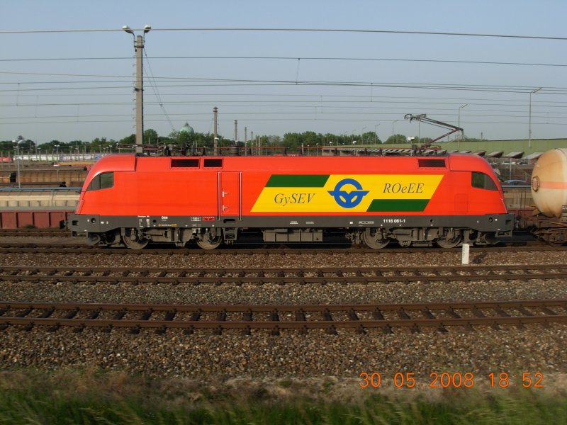 Nebel und Regen machten das Fotografieren der Rückfahrt des Sonderzuges R 16430 am 1.6.2008 von Mürzzuschlag nach Wien, welcher mit 1100.102 bespannt war, relativ schwierig. Diese Teleaufnahme mit 210 mm Brennweite und einer Verschlusszeit von nur 1/100 entstand auf der Geraden nach dem Bahnhof Gloggnitz.
