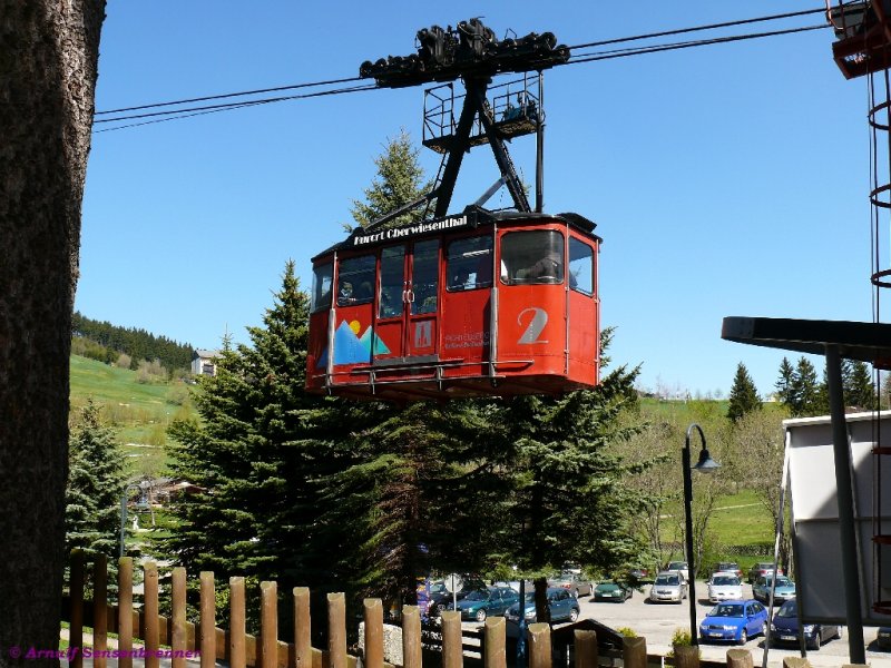 Blick von der Fichtelberg-Luftseilbahn hinunter nach Oberwiesenthal. Gut zu sehen sind unten die Schmalspurbahnstrecke der SDG-Fichtelbergbahn mit dem großen, 110 m langen und 23 m hohen, stählernen Gerüstpfeiler-Hüttenbachviadukt und recht davon den Werkstätten und Abstellgleisen der Eisenbahn.