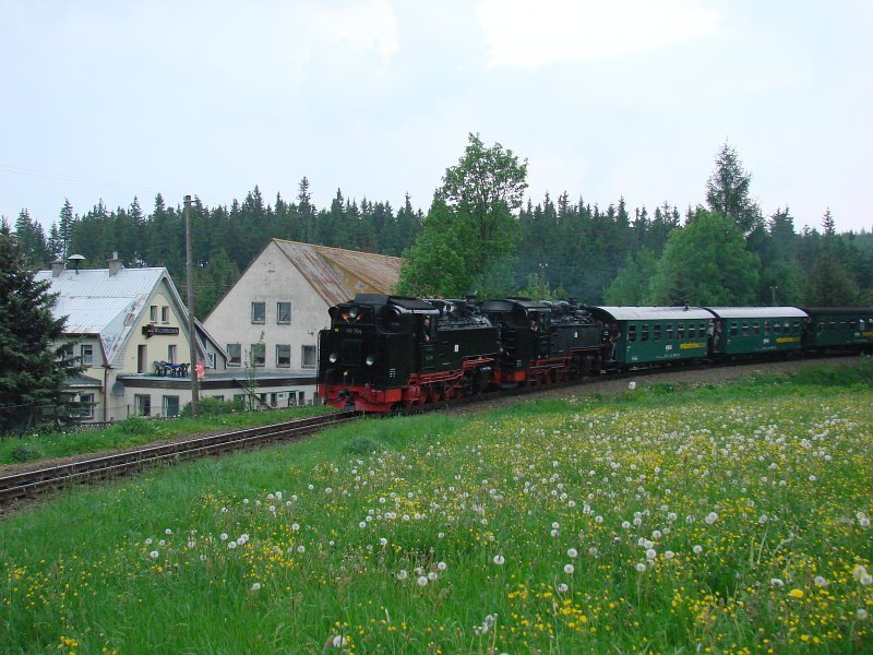 Kurz vor der Ausfahrt nach Oberwiesenthal lassen 99 761 und 99 794 am 31.05.2008 in Cranzahl noch mal Dampf raus