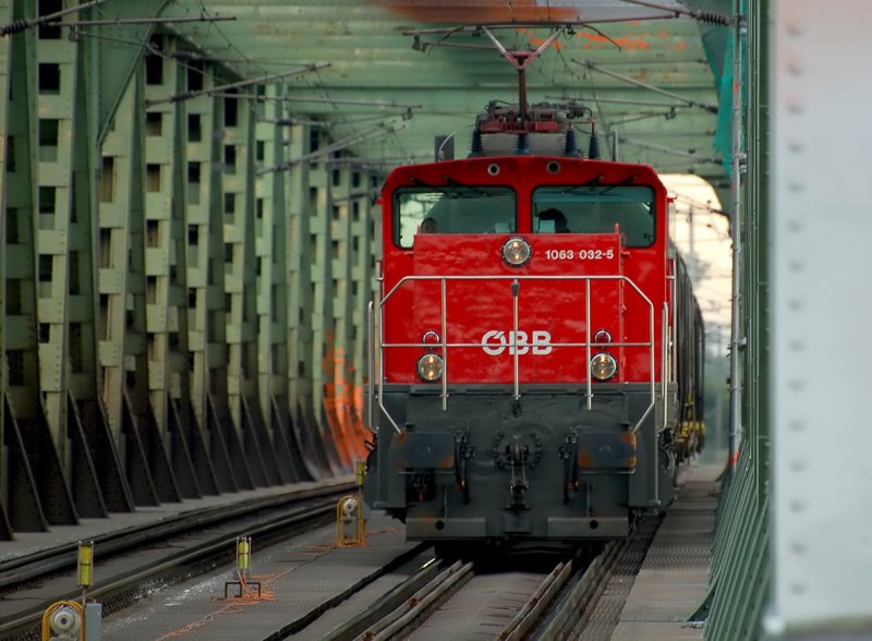 1063 032 ueberquert mit einem Gueterzug am fruehen Morgen des 21.06.2008 die Donau. Das Foto entstand eher zufaellig, deswegen die etwas eigenartige Perspektive;-)