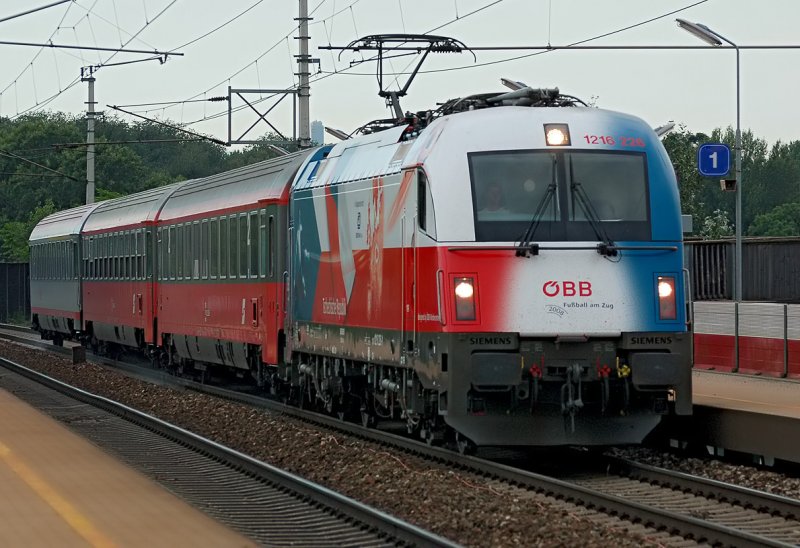 1216 226 "EM Tschechien" am Schnellzug D 270 von Wien nach Brno durcheilt die Station Praterkai. Das Foto ist am 21.06.2008 entstanden.
