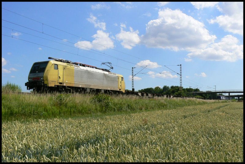 189 997 bespannt am 21.06.2008 den DGS 41062 von Melzo nach Wanne-Eickel. Der Zug heißt erst seit dem 15.06.08 so, zuvor war es der DGS 59614. Aufgenommen im Weizenfeld bei Lützelsachsen