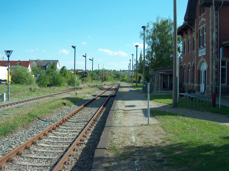Östliche Bahnhofseinfahrt in Vitzenburg. Das Gleis auf dem der Tw der Burgenlanbahn fährt gehört zur Unstrutbahn und das zugewachsene Gleis im Vordergrund zur ehemaligen KBS 587 von Vitzenburg nach Querfurt; 10.05.2008