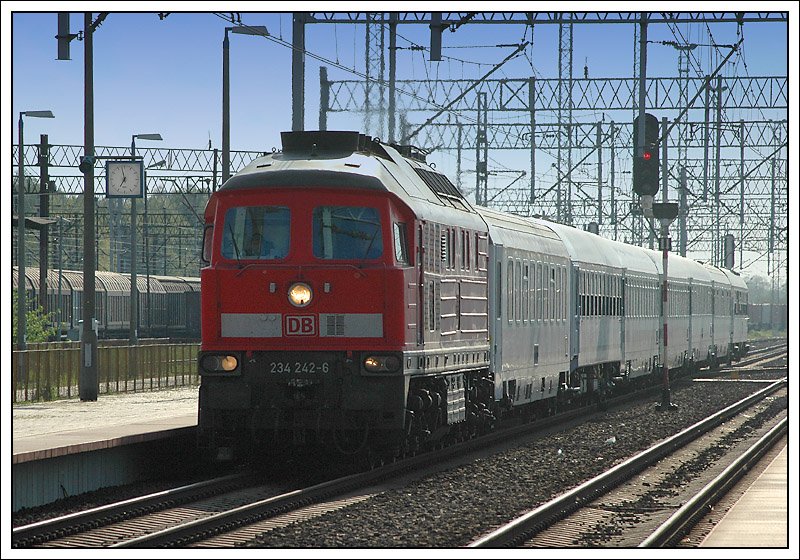 234 242 brachte am 1.5.2008 den EC 47  Berlin-Warszawa-Express  bis Rzepin, wo der Zug von einer polnischen E-Lok übernommen wurde. Mit diesem Zug fuhren wir an diesem Tag wieder retour nach Poznan. Ich glaub man merkt, dass hier extremes Gegenlicht war, aber mit Photoshop ist doch noch einiges möglich.