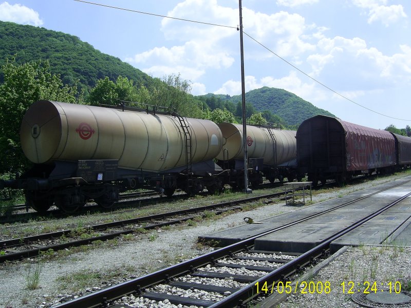 E-Lok 1044 094 fährt mit einem Kesselwagenzug von Trofaiach nach Donawitz. 24.06.2008