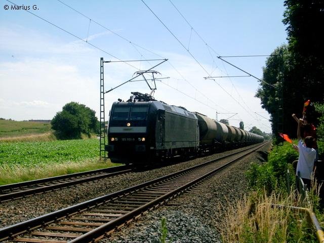 BR 185 551-9 mit Öller bei der Durchfahrt Trips, Gruß an die "Fanmeile" und an den TF, Danke für den Gruß