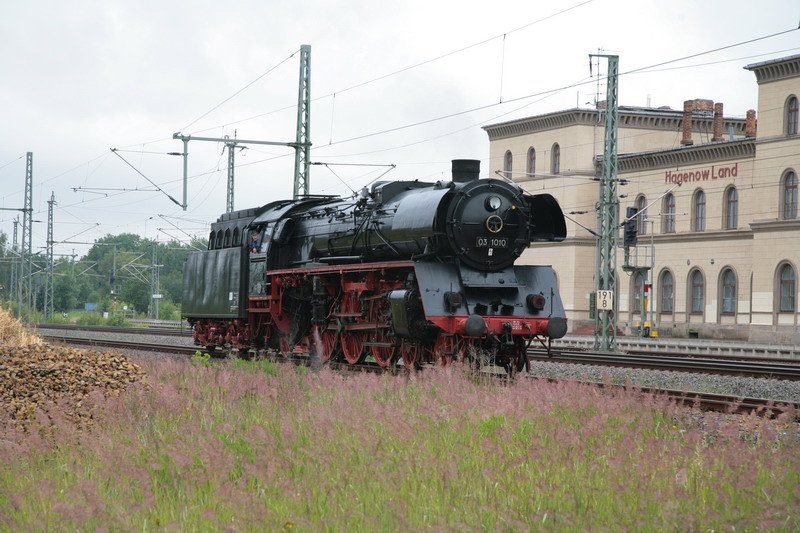 In Hagenow Land fährt hier die 03 1010 am Bahnhofsgebäude vorbei in das BW zum drehen, Wasser nehmen und bekohlen. 28.06.2008