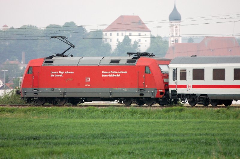 101 036-2 im Sonntagsdienst: Sie schiebt ihren IC Ulm entgegen. Im Hintergrund die barocke Stadtkirche zu Burgau im schwäbischen Holzwinkel. 29.06.2008 im Mindeltal.