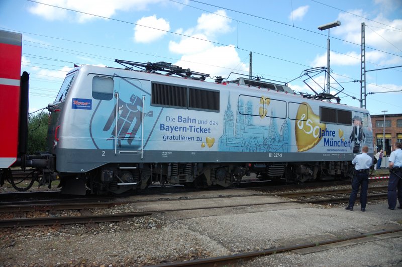 Das Handmuster der Jubiläumslok 111 027-9 "850 Jahre München". Vorgestellt am 31.05.2008 beim Tag der offenen Tür im Reisezugwagenwerk in Pasing. Noch fehlt die richtige Ordnungsnummer...