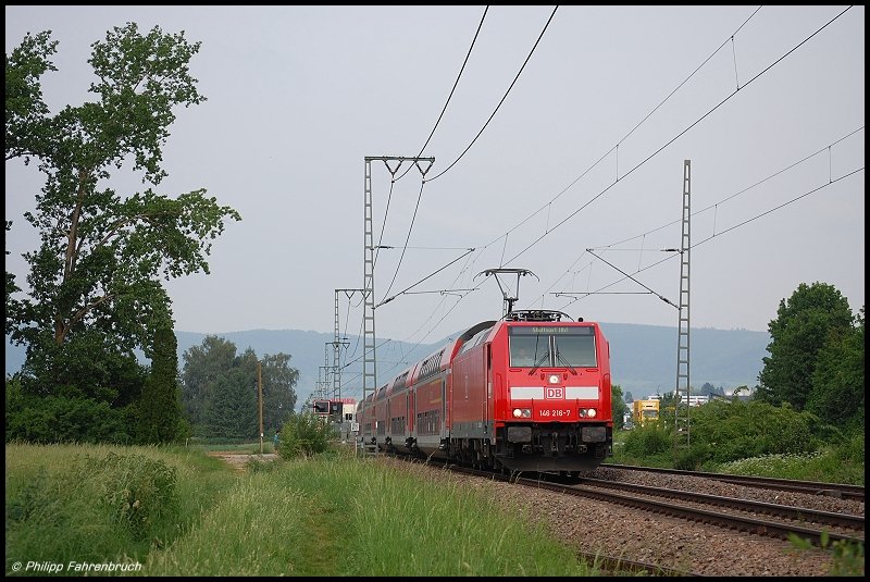 146 216 befördert am Abend des 28.05.08 RE 19470 von Aalen nach Stuttgart Hbf, aufgenommen bei Aalen-Essingen an der Remsbahn (KBS 786). Der nächste Halt ist Mögglingen(b Gmünd).