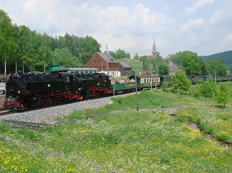 Die 1991 in im RAW Görlitz neu gebaute 99 772 steht mit einen beachtlich langen Zug (9 Wagen) am 01.06.08 abfahrbereit in Oberwiesenthal.