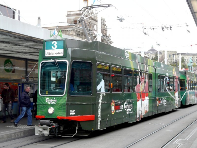 VBZ - Tram Be 4/6 2087 und der Tramanhänger B 2428 mit Vollwerbung für die EURO 08 unterwegs auf der Linie 3 am 19.04.2008