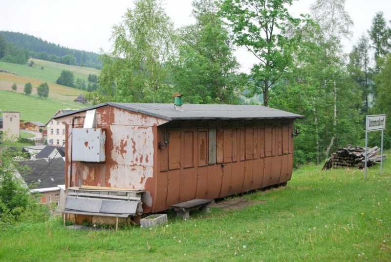 Am Haltepunkt Unterneudorf hat dieser Abteilwagenkasten die Zeiten überdauert, 01.06.08