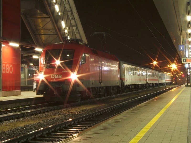 Der einmalige, aufgrund der Fußball-EM verkehrende D 15268 Wien West - Salzburg, mit Tfz 1016 009 im Hbf Wels. [09.06.08, 01:11]