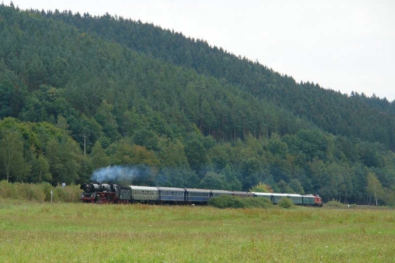 Auf dem Rückweg von Meiningen nach Berlin erwischte ich die 03 1010 kurz vor Wasungen im Werratal. Der Sonderzug war anlässlich der Meininger Dampfloktage 2007 aus Berlin hier hergekommen. (01.09.07)