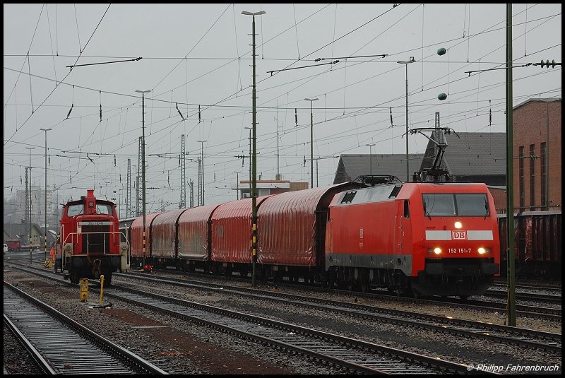 152 151-7 steht am 14.03.08 mit FZT 56080 nach Stuttgart-Hafen auf Gleis 8 des Aalener Bahnhofs. Danke an den Tf fürs Fernlicht.