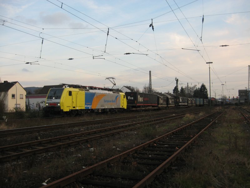 Das letzte was am 14.03.2008 bei Restlicht in Bad Honnef erlegen konnte: E189 992 der NF Cargo mit dem VOS Zug ist Richtung Norden unterwegs.