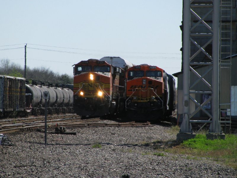 Links: Zwei Dash 9 der BNSF mit einem Güterzug, rechts ist die BNSF Lok 7509 (ES 44 DC) zusammen mit einigen Güterwagen abgestellt. Aufgenommen am 27.2.2008 in Sealy (bei Houston, Texas).