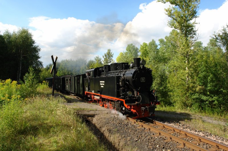 Mit dem letzten Zug dieses Tages erwischte ich Lok 9 in einem Waldstück kurz vor dem Hp Eduardschacht. Der Zug war gerade fertig mit dem Umsetzen und ist jetzt unterwegs zu den Fahrgästen, die zurück nach Klostermansfeld möchten. (18.08.07)
