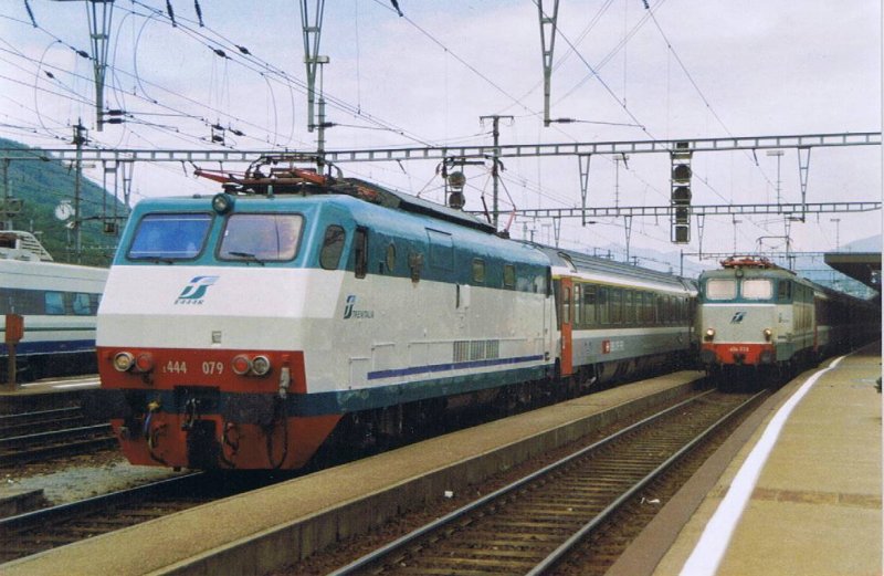 Eine E 656 und die E 444 079 stehen mit EC'S nach Milano in chiasso im Sommer 2003.Hinweis:Gescanntes Foto.