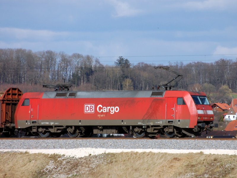 Man merkt 152 007-1 die Last an, die am Haken hängt. Vorne geduckt über der Schiene und hinten durch den schweren Holzzug aus den Federn gehoben... so geplagt unterwegs auf dem Weg nach Augsburg.