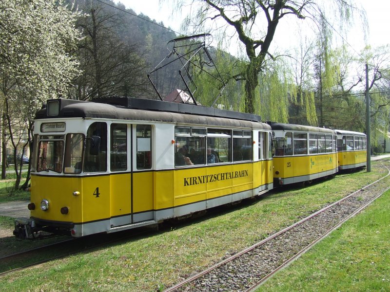 Wagen 4 der Kirnitzschtalbahn an der Haltestelle " Bad Schandau " - Ostern 2007 - hoffentlich geht das dieses Jahr auch so und nicht im Schnee !!!