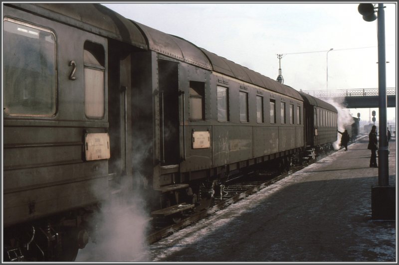 Die Dampfheizung im 1.Klasse Schürzenwagen sorgte für eine angenehme Wärme. Im Hintergrund ist wohl die Brücke zu sehen, von der Manfred gestern geschrieben hat. (Archiv Sibiu 12/1978)