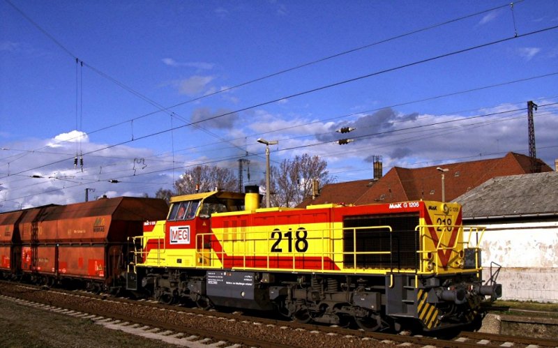MEG 218 mit Kohlependel Buna-Wählitz bei der Ausfahrt aus Großkorbetha. 16.03.08