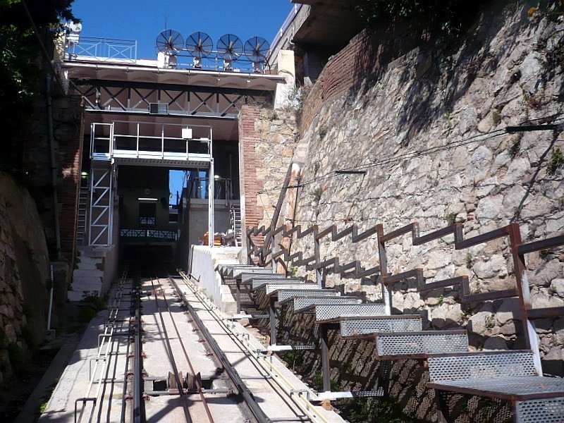 In Barcelona gibt es drei Standseilbahnen, hier am 08.03.2008 der entgegenkommende Wagen 2 in der Ausweichstelle der Seilbahn Vallvidrera Inferior - Vallvidrera Superior. Rechts hinter der Brücke, wo die Treppe unterbrochen ist, ist eine Zwischenstation.