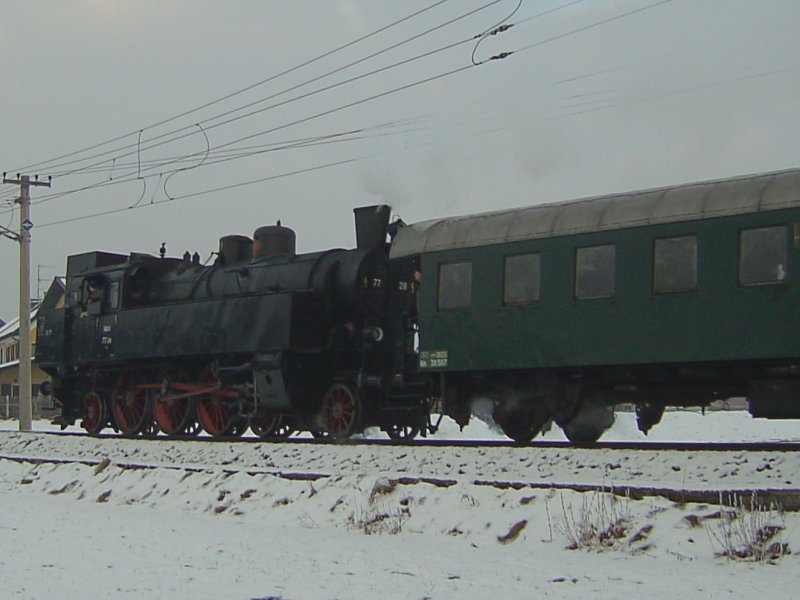 Die 77 28 am 24.12.2007 mit dem Christkindl Dampfzug von Salzburg nach Lamprchtshausen bei der Bahnhofseinfahrt in Bürmoos.