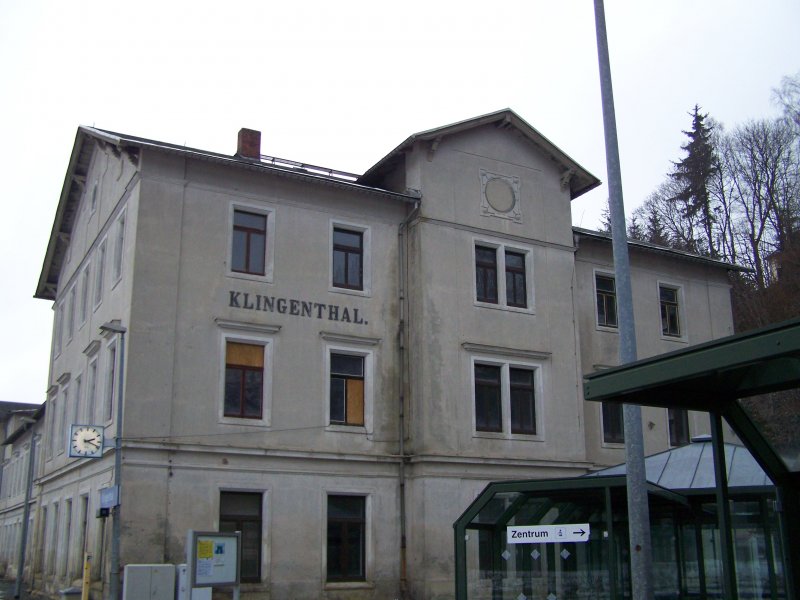 Das mehr als 120 Jahre alte EG des Bhf Klingenthal, seit Mitte der 90er Jahre dem Verfall preisgegeben, von der Bahnsteigseite aus.